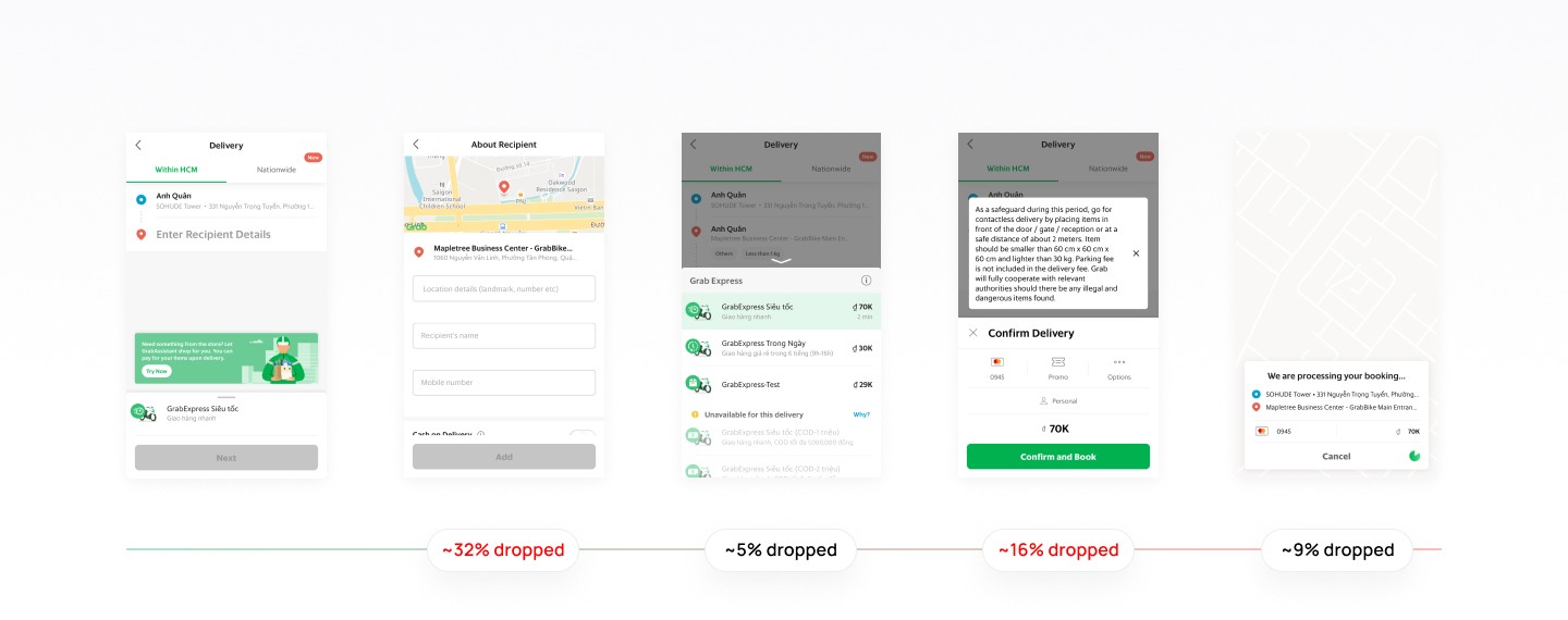 GrabExpress has long been serving Grab users by providing a simple, straightforward logistic service. However, from the current data of GrabExpress booking conversion funnel, the team was able to identify major drop-offs which results in Grab losing potential revenue.