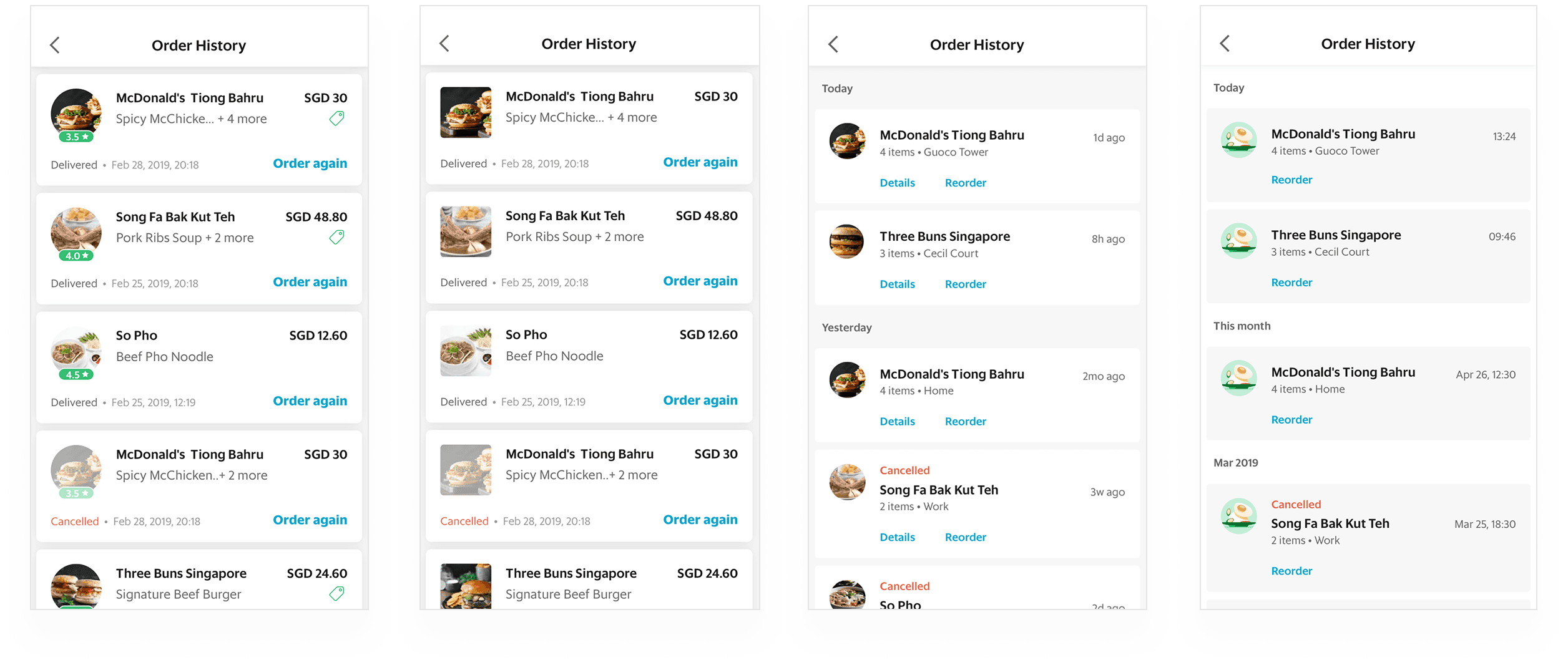 For the first challenge, I began with explorations that packed a lot of information into each card: delivery status, order price, date, items, ratings, and more. As I refined the design through multiple iterations, I reduced and simplified the information to highlight only what truly matters for the re order process.