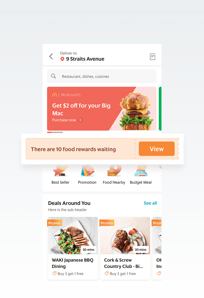 Showing food promos on the home screen increases discovery and makes it easier to choose rewards.