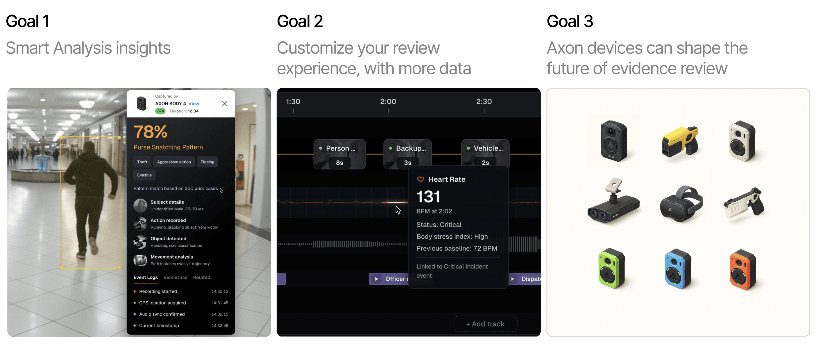 In terms of business proposition, another angle that helped make the case stronger was the ecosystem drive. The detection and analysis experience only really works when the input comes from Axon owned devices, like Body worn cameras and Fleet cameras.. Making that dependency explicit clarified the value story: better insights come from tighter device integration, thus encourages agencies to stay within the Axon ecosystem.